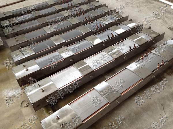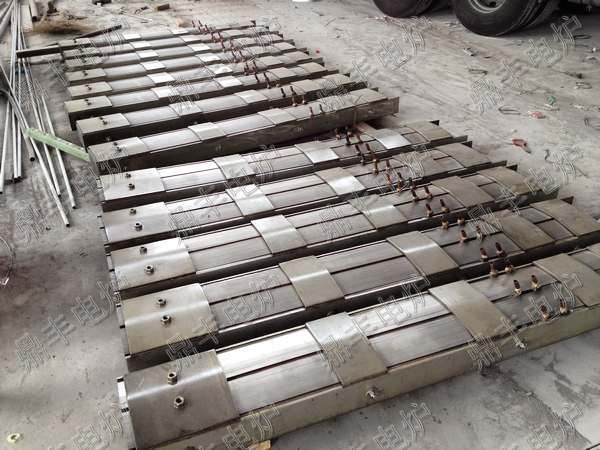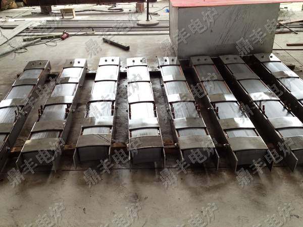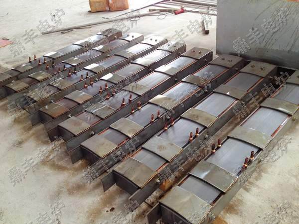 江苏鼎丰电炉设备有限公司生产的苏州电炉系列磁轭(硅钢柱)采用新日铁、武钢优质高导磁性冷轧硅钢片(上图磁轭全部采用新日铁取向钢制作),为确保铁芯叠装质量,鼎丰电炉硅钢柱安装制作项目部制作专用定位组焊和硅钢片叠装平台,叠片组装采用了穿芯螺栓紧固弧形叠装工艺,这种的结构压紧效果好、漏磁少。更加贴紧感应圈,改善磁通走向,消除铁芯在接缝处的局部磁通饱和现象,降低了铁芯的空载损耗、空载电流,充分利用硅钢片的导磁面积,减少中频感应熔炼炉炉体局部发热的可能性。磁轭封面不锈钢板与硅钢片接触部用高档金云母板隔开,外侧用不锈钢夹持住焊接固定,在磁轭与不锈钢板夹之间装有特殊设计的断路铜质散热管,经通水冷却磁轭,保证上硅钢柱处于常温状态,在硅钢柱两侧用4根不锈钢镙栓夹持锁紧,避免温度升高产生变形,覆盖感应线圈表面的60%以上,有效的把磁力线聚集到熔池中,防止炉壳发热,提高了系统效率;性能稳定同时也给线圈以可靠的支撑,提高了炉体整体强度。鼎丰电炉生产的中频炉磁轭(硅钢柱)在制作及出厂前,严把质量关,为确保硅钢柱制作质量的过程控制,在叠装前对硅钢片各项参数进行了检查,同时每一张硅钢片在叠装前都要经过外观检查,通水槽冷却铜管均通过耐压和通水实验,外层喷涂美国杜邦公司的Dote防电弧绝缘漆,有效的阻止了硅钢片的分切面通磁、生锈保证了磁轭硅钢片的质量。